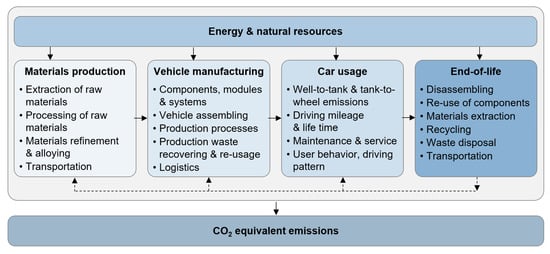 Main phases and influencing factors of a CO2 equivalent-emissions-focused automotive LCA.