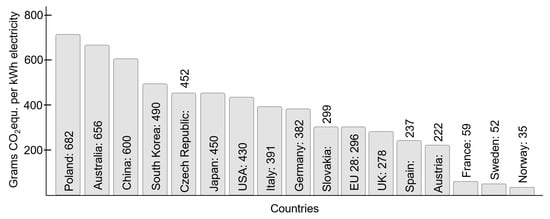 CO2-equivalent-emission intensity of electricity production in selected countries [,,,,,].