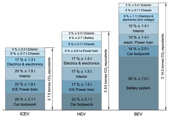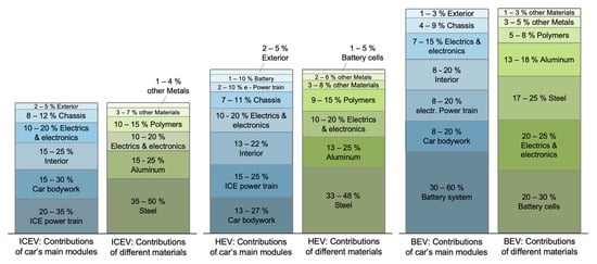 Figure 6 shows a detailed breakdown of the contributions to CO2-equivalent emissions in vehicle production. The representation is based on Figure 5 but displays a more specific view on the main modules’ impacts and a segmentation of the different materials. The car’s main modules are defined according to the classification made in Section 3. It has to be considered that for all three vehicle types, ICEV, HEV and BEV, the total size of each column indicates 100%. In this way, the percentages of contributions of the individual factors are shown for each vehicle powertrain technology separately.