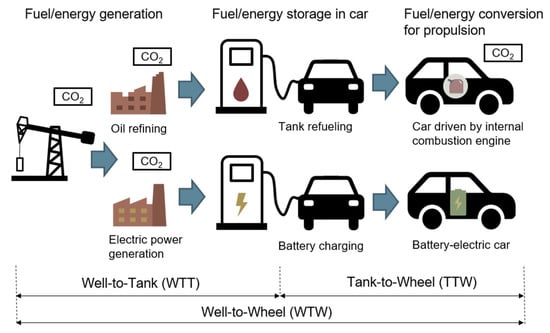 For ICEV, there are several factors to be considered in the calculation process of WTT emissions, including type and quality of crude oil, upstream technologies of fuel production, transportation and distribution. In this way, WTT emissions are in the range of 10% to 20% of the TTW emissions for conventional fuel, with a lower impact for diesel and higher impact for gasoline fuel []. In the combustion engine, hydrocarbons of fuel are burned by use of aspirated air. Considering the average content of hydrogen and carbon and assuming perfect combustion [], the TTW emissions can be calculated directly from the fuel consumption with linear factors: