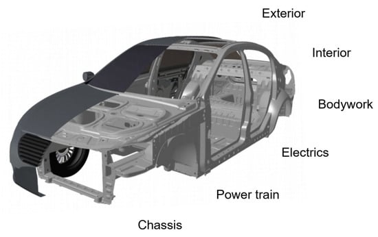 In many cases, the inventory analysis is conducted in form of a top-down breakdown, which targets the definition of main modules. In subsequent steps, the main modules are fragmented into various submodules and components, which for each the required data for the LCA are generated. This includes a detailed analysis of materials and the chain of manufacturing-related processes. Figure 8 shows an exemplary top-level structure of a car, including the main modules. Depending on vehicle type and size, implemented technologies, powertrain system and equipment, each module influences the results of an LCA in different ways.
