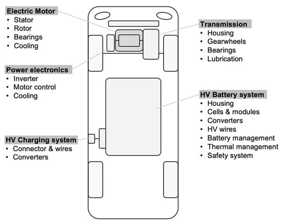 The powertrain structure of electric cars is simpler considering the mechanical parts but includes a higher share of electrical components and the complex high-voltage battery system for electric-energy storage (Figure 10). This comprises an electric motor, holding stator and rotor, power electronics as well as high-voltage charging system. Depending on the applied electric-motor technology, magnetic materials might be used (e.g., in permanent magnet-synchronous motors), which requires high effort for the provision of the corresponding resources []. In addition, copper and semiconductor-based components are applied in various components, e.g., inverter, converter and battery.