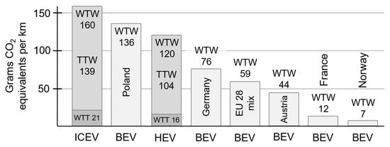 The diagram in Figure 15 shows the well-to-wheel (WTW) CO2 equivalent emissions of the investigated compact cars with different propulsion systems and varied carbon footprint of electricity production. It is visible that hybrid propulsion technology has the potential to reduce the carbon footprint by about 25% in comparison to conventional combustion engines. Considering the behavior of electric cars, the importance of low-carbon electricity production is clearly demonstrated (c.f. Figure 3 and Figure 4). In this way, a modern hybrid car can have a lower use-phase-related greenhouse-gas-emission impact than an electric car that is charged in a country or region with highly carbon-intensive electric-power generation. It is interesting to see in Figure 15 that in most of the exemplarily considered countries, the usage of BEV leads to a significantly lower carbon footprint than those of ICEV and HEV. In countries with very low carbon-intensive electric-power generation, the well-to-wheel CO2-equivalent-emission impact can be reduced to 7.5% (France) or even 4% (Norway) in comparison to those of the ICEV.