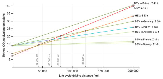 The high CO2-equivalent emissions of BEV production are compensated relatively quickly in case that the cars are operated in countries with low-carbon electricity production, e.g., Norway. Considering the average EU 28 electricity mix, the break-even point with ICEV is reached at about 65,000 km. In the case of high-carbon electricity production, e.g., in Poland, the break-even point will not be reached within the considered mileage range of 200,000 km. HEV are characterized by about a 20% higher carbon footprint production than ICEV, but have considerably lower CO2 emissions during operation, which leads to significant advantages of the lifetime CO2-equivalent-emission behavior. However, the potentials of BEV that are charged with low-carbon electricity can clearly not be reached with combustion-engine-based technologies.