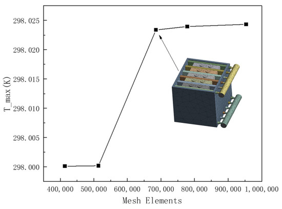 The model with an inlet size of 5 mm was selected as the experimental object for grid independence verification, and six thermal management models with different grid numbers were verified with Fluent 20.0. The number of grids is compared: 413,792, 513,742, 684,884, 778,326, and 953,749. The result of grid verification is shown in Figure 2. When the number of grids tends to 684,884, the highest temperature of the entire system tends to stabilize; 684,884 was selected as the grid number of the BTMS model in this paper.