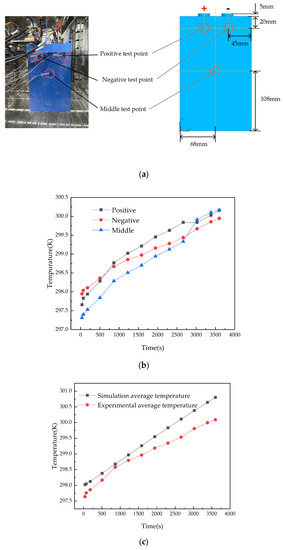 The thermal management device is placed in a constant temperature and humidity box, with an ambient temperature of 298 K and a humidity of 0%, and the convective heat transfer coefficient of the environment is 5 W/(m2·K). Set the battery pack discharge rate to 1C, that is, set the discharge current to 72 A, and set the simulation duration to 3600 s in the simulation. The battery temperature collection points are shown in Figure 3a. T-type thermocouples are used to paste three points on the surface of the battery. The T-type thermocouples are connected to the Agilent digital logger, which can accurately transmit data to the computer. The measured points are the positive electrode area, negative electrode area, and middle area. As shown in Figure 3b, the temperatures of the three points are different. The temperature of the positive electrode area is the highest, followed by the negative electrode area, and the lowest temperature is the middle area. Therefore, we use the average temperature of three points to compare with the simulation, as shown in Figure 3c. The results show that there is a gap between the data and the simulation at the beginning of the experiment. The reason may be that the thermocouple connector installed on the surface of the battery exchanges heat with the air, which leads to temperature errors. In addition, the temperature of the laboratory environment may also affect the experimental results [25,26,27]. The experimental results are consistent with the numerical results, and the maximum temperature difference between the experimental and simulation results is 0.5 K. In short, the battery thermal management simulation model is accurate enough to research the heat performance of BTMS.