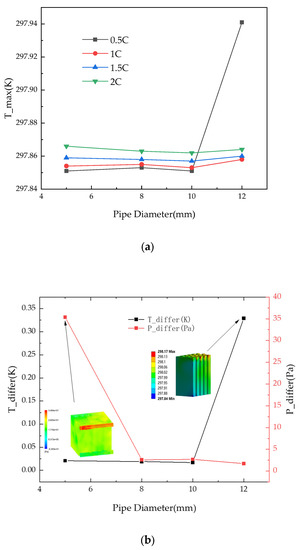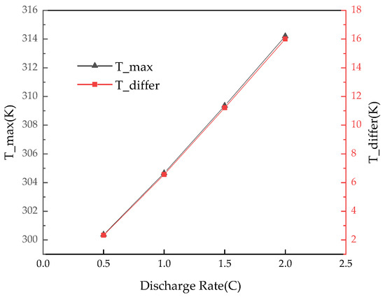 Before analyzing the influence of inlet size, flow rate, and liquid temperature on the BTMS, we first simulated the discharge state of the battery in a natural environment at 298 K without BTMS interference. The maximum average temperature and maximum temperature difference of discharge are shown in Figure 4. The results show that the maximum temperature of the battery surface(T_max) and the temperature difference between the battery pack(T_differ) increase with the increase in the discharge rate. When the discharge rate is 2C, the T_max is 314.2 K, and the T_differ is 16 K, which is completely outside the range of the maximum temperature difference allowed for the normal operation of the battery. Therefore, it is necessary to manage the temperature of batteries.