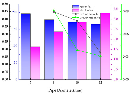 To analyze these data more effectively, the convective heat transfer coefficient h and the Nusselt number Nu were selected for quantitative analysis. As shown in Figure 6, the convective heat transfer coefficient of the BTMS decreases as the inlet size increases. When the inlet size is 5 mm to 12 mm, the convective heat transfer coefficient h is reduced from 196.327 W·m−2·K−1 As small as 164.792 W·m−2·K−1. The Nusselt number Nu increased from 1.636 to 3.296. This is because the increase in pipe diameter increases the contact area between the liquid and the aluminum plate. Although the overall convective heat transfer coefficient of the BTMS decreases with the increase in pipe diameter, the Nu growth rate curve shows that the overall heat transfer intensity of the BTMS is increasing. This shows that the increase in inlet size improves the ability of the battery module to conduct heat to the outside.