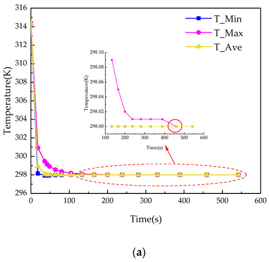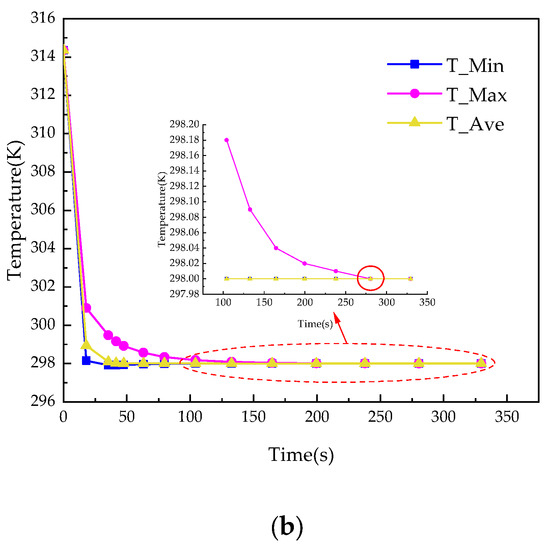 After the above comparison, we found that the difference between 8 mm and 10 mm diameter is not obvious. Therefore, for better selection, we set the initial temperature of the battery to the temperature after the 2C discharge state and then cool the battery by passing liquid through the BTMS. It was found that, as shown in Figure 7a, when the maximum temperature of the battery was reduced to 298 K, the time required for a pipe diameter of 8 mm was 459.7 s, while as shown in Figure 7b, the time required for a 10 mm pipe was 280.5 s, which shows that the cooling time of the BTMS with a diameter of 10 mm is shorter than that of 8 mm. From this, it can be judged that in order to achieve faster and better thermal management, the diameter of 10 mm is the best.
