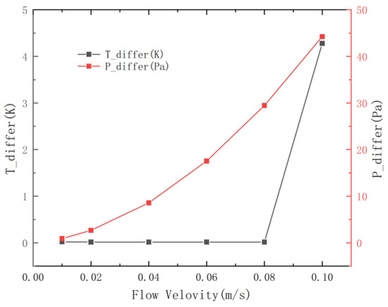 Similar to the method of 4.1, the inlet size is fixed, and the optimal inlet size in the previous analysis is selected. The liquid with a flow rate of 0.01~0.1 m/s [29] is selected to pass through the inlet, and the temperature change and pressure difference change are observed.
