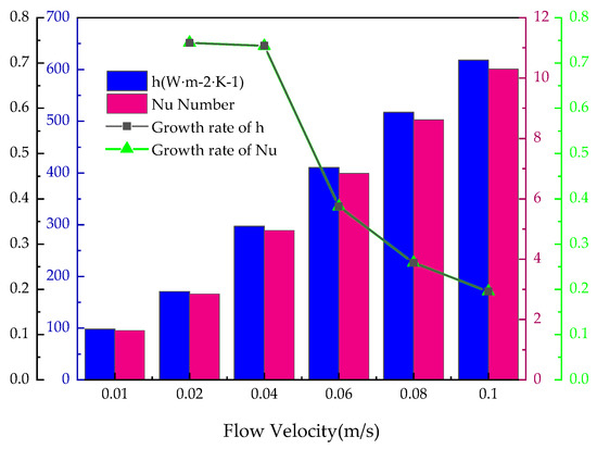 Similarly, two criterion numbers, the convective heat transfer coefficient h and the Nusselt number Nu, will be used to analyze and discuss. As shown in Figure 9, as the flow velocity increases, both the convective heat transfer coefficient h and Nu gradually increase, and the convective heat transfer coefficient increases from 97.981 W·m−2·K−1 to 618.216 W·m−2·K−1, Nu Number increased from 1.633 to 10.304. This is because when the flow rate increases, the coolant flow into the BTMS also increases, enhancing the heat transfer intensity of the BTMS. According to the growth rate curve of h and Nu, it is found that when the flow velocity is 0.02 m/s, the growth rate of both reaches the highest. Therefore, for this BTMS, 0.02 m/s is the optimal flow rate.