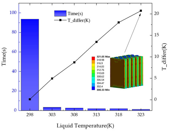 According to the results of Section 5.1 and Section 5.2, the BTMS works best when the inlet size is 10 mm, and the flow velocity is 0.02 m/s. In a low-temperature environment of 253 K, when the temperature of the incoming fluid is 298 K, 303 K, 308 K, 313 K, 318 K, 323 K, the time required to reach 298 K is simulated and analyzed. As shown in Figure 10, it shows that the duration of 323 K is the shortest, only 2.31 s. However, the size of the temperature difference increases as the temperature of the incoming fluid increases. At 323 K, the temperature difference of the single-cell reached 20.72 K. Because the battery temperature difference needs to be controlled within 5 K [30], only when the fluid temperature was 298 K and 303 K did the maximum temperature difference remain below 5 K. However, hot water at 303 K takes at least ten times less time to heat the battery to 298 K (room temperature) than water at 298 K.