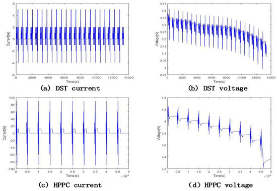 Battery A is verified under DST using the three EKF, AEKF, and HIF algorithms to fuse it, and the terminal voltage residuals and SOC estimated by the three algorithms are imported into the fusion algorithm. The working condition current and voltage are shown in Figure 3a,b. Battery B is verified under HPPC conditions using the three EKF, AEKF, and HIF algorithms to fuse it, and the terminal voltage residuals and SOC estimated by the three algorithms are imported into the fusion algorithm. The working condition current and voltage are shown in Figure 3c,d.