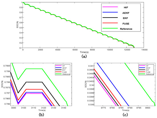 (a) SOC estimates under HPPC; (b) Local graph of SOC estimates under HPPC; (c) Local graph of SOC estimates under HPPC.