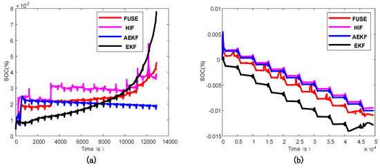 (a) SOC estimation errors under DST; (b) SOC estimation errors under HPPC.