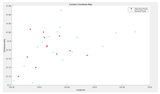 From relevant literature, it is known that an electric vehicle can drive no more than 3 km after a power-off warning is sent out. Therefore, the maximum driving distance was set to 3 km. Based on this, we further analyzed the candidate points in Figure 2 and obtained the demand points covered within the radius of 3 km for each candidate point, as shown in Table 9.