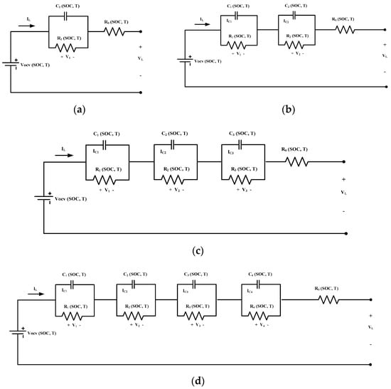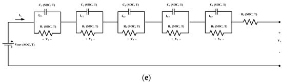 An equivalent circuit model was developed to estimate the behavior of the lithium battery. The model selected for the work is INR18650-20R. This model was further validated by using the dynamic current profile test, which has the advantage of regenerative breaking. An equivalent circuit model consists of an ideal voltage source, the R-C network, which represents the characteristics of the cell, including the internal resistance that plays a major role in defining the cell behavior. Each element of the circuit is a function of SOC and temperature. In Figure 1a–e, 1 R-C to 5 R-C models are represented.