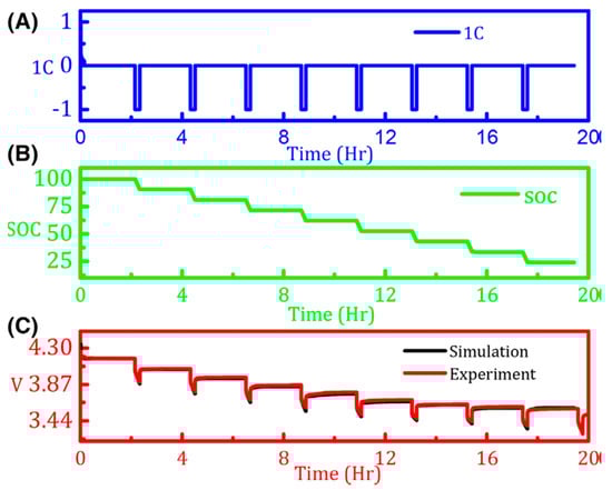 Figure 2. (A) Incremental Open Circuit Voltage load profile. (B) SOC under parameter estimation. (C) Simulated and experimental voltage response.