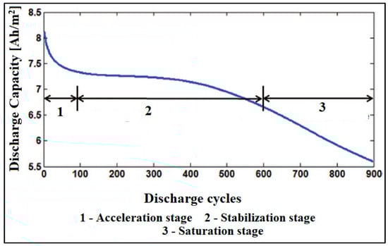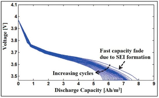 The development of the Solid Electrolyte Interface (SEI) on the negative electrode is the major contributor for calendar ageing. Cycling ageing is mainly due to lithium plating of the negative electrode. As EVs spend most of the time at rest having lower current levels around 3C [33], calendar ageing of the battery also becomes a vital factor in the development of the battery ageing and replacement model. SEI formation on the negative electrode results in the consumption of cyclable lithium content, leading to an increase in the value of electrode impedance. In the acceleration stage, capacity fade is faster, due to SEI formation on the anode surface. With the increase in SEI interface, there is an isolation effect on the electrode, thus resulting in decrement in chemical reaction rate. This results in the stabilization mode of the battery, as shown in Figure 4. At this stage, the battery performance gradually drops down and eventually leads to early cutoff voltage for the battery. In the saturation stage, the poor capacity on the cathode makes the cathode quickly saturate during discharge, and also quickly deplete during charge. The capacity fade in the discharged curves of an aged battery is shown in Figure 5, which indicates a high rate of capacity fade in the initial cycles, due to SEI. Moreover, the cycling aging affects the concentration and volume of the battery. The battery aging is path-dependent, especially when the battery is subjected to power cycles and calendar periods [33].