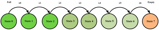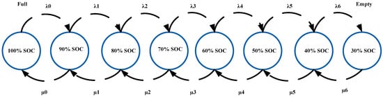 The probability matrix ‘m’ of the battery discharge model is represented in (2). The probability with which there is change in the states is represented by λ n , where n is from 0 to 6, representing transition numbers. Various state equations are represented in Equations (3) and (4), where S1 represents State 1, S2 represents State 2 and so on.