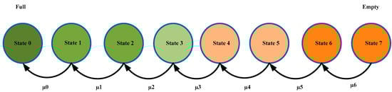 The second case is where EVs’ mode can be further subdivided into two categories, namely (i) EVs in the discharge cycle and (ii) EVs in discharge-and-charge cycle. EVs in the discharge cycle are EVs that are in use, with the batteries being drained continuously to power the vehicle. It is inherent that the battery is discharged in this mode. The EV can be assumed to return back to its own charging station (starting point of the drive cycle or pavilion) or any intermittent station after it reaches the predefined depleted state which corresponds to the point where the EV must be charged. The model can be represented by n states. However, the model represented consists of eight states, beginning from 100% SOC of the battery, represented by State 0, down to 30% SOC, represented by State 7, which is assumed to be the depleted state.