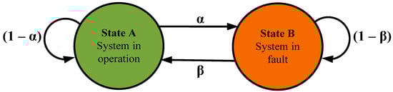 As shown in Figure 10, the parameter α represents the probability of change in the system from state of operation to fault state, and β represents the probability of change in the system from state of fault to state of operation, which can be represented as ratios mentioned in Equations (11) and (12). The fault rate and repair rate can be termed as mean operating time and mean down time. The transition probabilities from State A to State B for the system shown in Figure 10 can be represented in a probability transition matrix, as given in Equation (13).