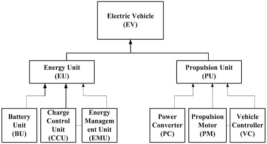 For the system with continuous faults and repairs, the probability density function is always exponential. The reliability, r(t), and maintainability, m(t), of the system at any time, ‘t’, is defined by Equations (14) and (15). For a system such as the electric vehicle (EV), as shown in Figure 11, the entire unit can be divided into two major units categorized as the Energy Unit (EU) and Propulsion Unit (PU). The EU comprises the Battery Unit (BU), Charge Control Unit (CCU) and Energy Management Unit (EMU), while the PU consists of the power converter (PC), propulsion motor (PM) and vehicle controller (VC). The reliability of the EV depends on the reliability of the EU and PU, as discussed in the sections below.