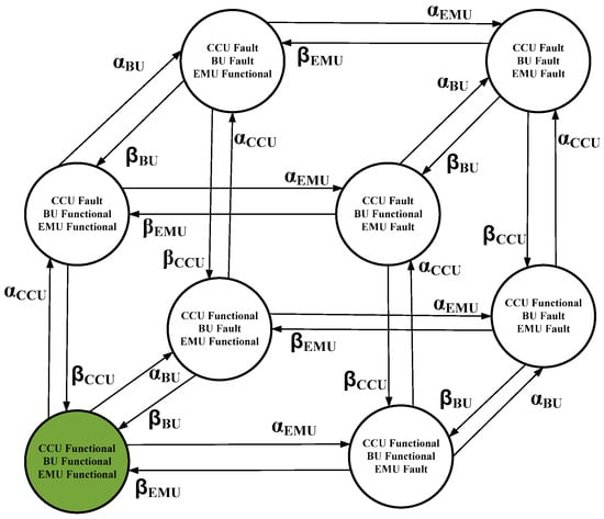 The reliability of the electric vehicle depends mainly on the Battery Unit (BU), which can be considered an essential part of the Energy Unit (EU) of the vehicle. At any given time, the BU may be in either the ‘system in operation state’ or ‘system in fault state’, which, in turn, represents the state of the electric vehicle. The faulty condition of the EU may occur due to two reasons. First, the battery might have lost all of its energy in powering up the vehicle—discharged state; and second, the battery would have lost its ability to store charge—broken state. Along with BU fault, the units such as the Charge Control Unit (CCU), which regulates the rate at which the battery is supplied with current for charging, and the Energy Management Unit (EMU), which prevents the battery from overcharging and undercharging, also play an important role in maintaining the operating condition of an electric vehicle. As discussed in the case of the BU, the CCU and EMU also have two states which can be in either the ‘system in operation state’ or ‘system in fault state’. Therefore, the three different systems in two conditions result in a total of eight transitional combinations. Figure 12 shows the state space diagram of the EU, illustrating various transitions of different states. Moreover, α C C U , α B U and α E M U represent the fault rates and β C C U , β B U and β E M U represent the restoration rate of the CCC, BU and EU, respectively. The state space transition matrix (SSTM) of the EU is represented in Equation (16), where α x , α y , and α z represent α C C U , α B U and α E M U , respectively, and β x , β y , and β z represent β C C U , β B U and β E M U , respectively.