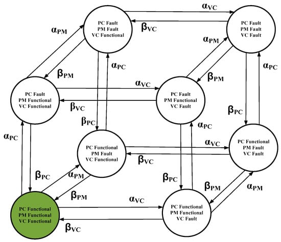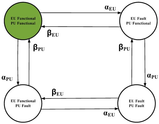 The EU will be functional provided that all the other units are functional, that is, as represented by the equation P E U ( 1 ) , which is, in turn, representing the availability of the system. The remaining states, which represent at least one of the units in fault condition, makes the system to enter into fault state. Thus, the unavailability of the EU, UEU, is the net probability of these seven states and can be calculated from Equation (25). After eliminating the fault states, the state space transition matrix reduces to the matrix S S P M Q given by Equation (26).