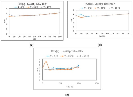 Figure 16. (a) OCV vs. SOC for 1 R-C, (b) OCV vs. SOC for 2 R-C, (c) OCV vs. SOC for 3 R-C, (d) OCV vs. SOC for 4 R-C and (e) OCV vs. SOC for 5 R-C.
