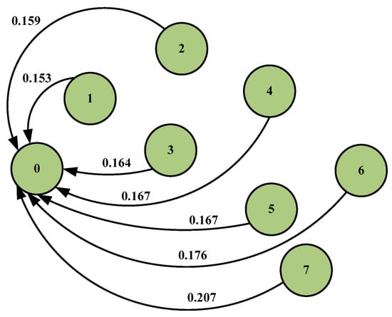 According to the Markov model, the initial computation matrix, P ( 0 ) , is represented in Equation (7). Transition probability matrix, m n , for n step is represented in Equation (8). Using the theorem of total probability, we see that the consecutive transition of the states is given by Equation (9). The probability of the state of the system, p j , after first transition can be represented by Equation (10).