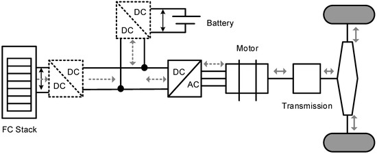 The downside of the above strategy is too many transmission processes, leading to efficiency loss. With the development of fuel cell technology, breakthroughs have been made in fuel cell system’s power, durability, and dynamic response. Therefore, the energy management strategy is also changing. The significant difference is that the fuel cell system makes more contribution on driving. The diagram of the fuel cell electric vehicle powertrain system is shown in Figure 1.