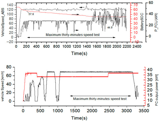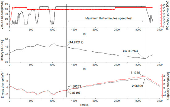 The measurement results of the maximum thirty-min speed are shown in Figure 3. The vehicle’s maximum thirty-min speed measurement result was 68.5 km/h. In maximum thirty-min speed test, the SOC was reduced from 44.99% to 37.34%, the maximum consumption capacity was 6.14 Ah, and the maximum electrical energy consumption was 2.97 kWh. The power of the fuel cell system remains constant during the maximum thirty-min speed test. Even if the vehicle speed dropped to zero at about 1000 s, the fuel cell system still outputs a high output power, thereby reducing the voltage fluctuation of the fuel cell stack and realizing fast charging of the traction battery. More discussion concerning this topic can be found in Section 4.3.2.