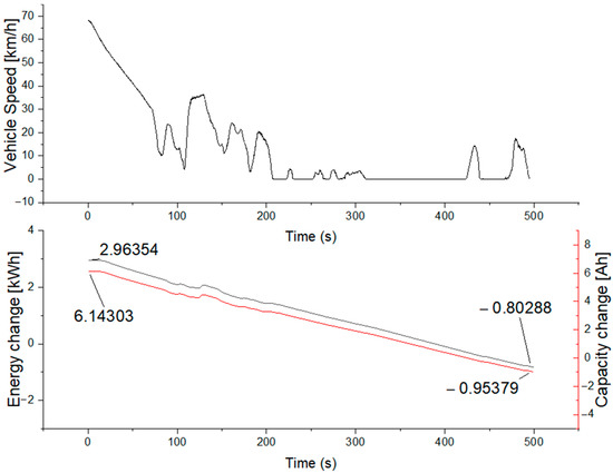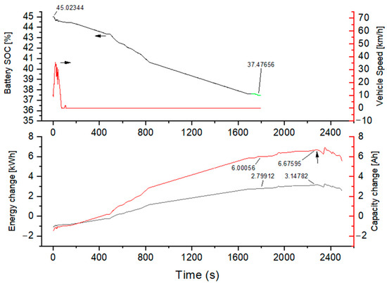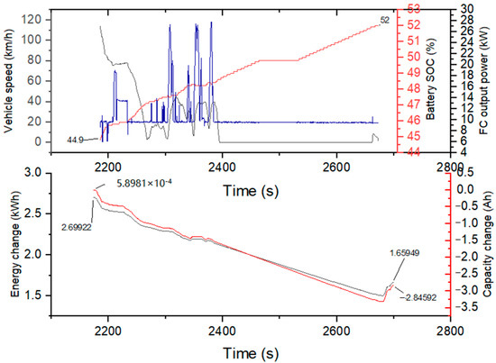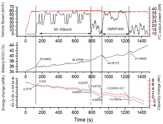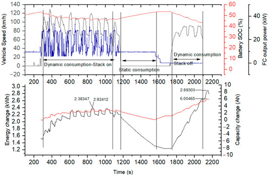 As mentioned above, the fuel cell system charged the traction battery during the transfer process. The power consumption test data are shown in Figure 5. Energy consumption needs to be performed before the accelerated test to ensure the results’ consistency. The vehicle had a pure electric mode with the fuel cell stack closed. Air conditioning and auxiliary machines consumed the electrical energy coming from the battery until the capacity target value of 6.68 Ah. The electrical energy value is 3.15 kWh (target value 2.97 kWh), and the capacity value is 6.68 Ah (target value 6.14 Ah). At this time, the SOC drops from 45.02% to 37.48% (target value 37.34%). It means whether the energy change or capacity change can indicate the change of the battery SOC.