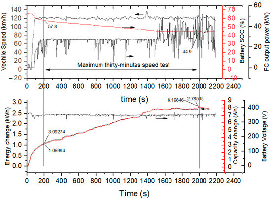 The vehicle’s maximum thirty-min speed test data are shown in Figure 8. The SOC changed from 57.8% to 44.9% at the maximum thirty-min speed. The capacity changed from 3.09 Ah to 8.20 Ah, and the electrical energy changed from 1.07 kWh to 2.79 kWh. The SOC of the battery continued to decrease during the whole test. At 1511 s, the SOC of the traction battery decreased to 44.8%. Then it was in a stable state, indicating that 44.8% is the lower limit of the SOC of the traction battery. At the same time, the power fluctuation of the fuel cell stack increases significantly. Since the electrical energy and electric power are constant, it clearly shows that the fuel cell system is currently following the load, which contrasts with the vehicle with the stepped control strategy. More discussion can be found in Section 4.3.1.