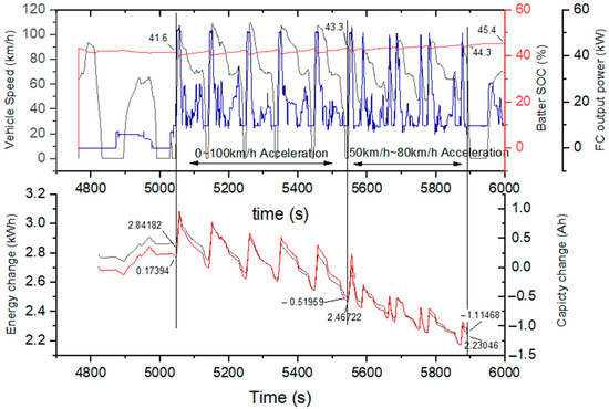 The vehicle acceleration test data are shown in Figure 11. The traction battery was charged from 41.6% to 43.3% in the 0~100 km/h acceleration test. The electrical energy changed from 2.84 kWh to 2.47 kWh, and the capacity changed from 0.17 Ah to −0.52 Ah. In the surpassing acceleration test, the traction battery was charged. The SOC changed from 43.3% to 44.3%. The electrical energy changed from 2.47 kWh to 2.23 kWh, and the capacity changed from −0.52 Ah to −1.11 Ah. Therefore, it proves that in the acceleration test of 0~100 km/h and 50~80 km/h, the output power of the fuel cell stack charged the traction battery while meeting the power demand of the whole vehicle. More Discussion is in Section 4.3.3. At the same time, the changes in electrical energy, capacity, and SOC showed a high consistency.
