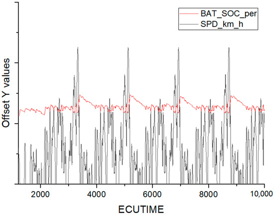 After further analysis, we realized that since we used the acceleration condition, especially at the beginning of the test, we first used the maximum thirty-min speed test for initialization. Then we take the lowest value of SOC in this process as the starting test point to ensure the consistency of subsequent test results as much as possible. It means that if a bus adopts the following power control strategy, the result of external characteristics will be almost the same as that of the passenger car that uses the following power control strategy. To validate our idea, we conducted a verification experiment, and the results are as follows: Figure 12 shows the relationship between vehicle speed and SOC, and this periodic change can be seen clearly.