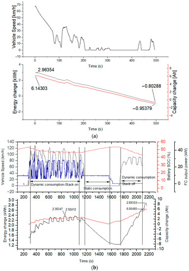 Conventional power consumption methods include static power consumption of accessory power consumption and dynamic power consumption of driving power consumption. The power consumption test is simple for FCV A, since FCV A vehicles have pure electric driving functions, but it is challenging for FCV B. In the power consumption test in Section 4.2.2, we found that for the vehicle that adopts the following control strategy, the conventional power consumption method cannot be used to reduce the SOC of the power battery to achieve the expected target. The target value of SOC is reached. There are two possibilities. One possibility is the influence of the control strategy. The control strategy does not allow the lower limit of SOC to be reached in this case. The corresponding SOC value is 45.6%. The other possibility is measuring error, since it was close to the lower SOC value (44.8%). However, the maximum electrical energy and capacity values were 2.38 kWh and 2.92 Ah, which is far from the target electrical energy value (2.79 Ah) and the capacity target value (8.20 kWh).