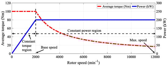 The traction motor is an integral part of EV powertrains and plays a significant role in their design architecture. Depending on the application, the selection of a traction motor involves many considerations, such as simple construction, ruggedness, being lightweight, volume, cost, efficiency, torque density, the ease and flexibility of the electric drive control, fault tolerance and harshness capability, a fast and quick torque response especially at starting, a wide constant power speed range (CPSR), low acoustic noise (torque ripple), low rotor inertia, regenerative braking and overload capability, good temperature management, as well as high operational reliability on different driving conditions [2,5,10,11,12]. Among these various requirements, an excellent flux weakening defined by a wide CPSR capability curve, as shown in Figure 1, is often required in EV operational performance.
