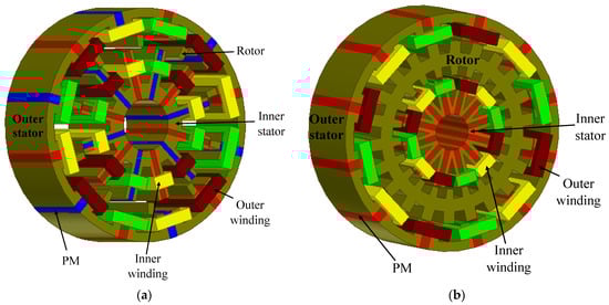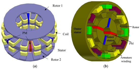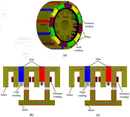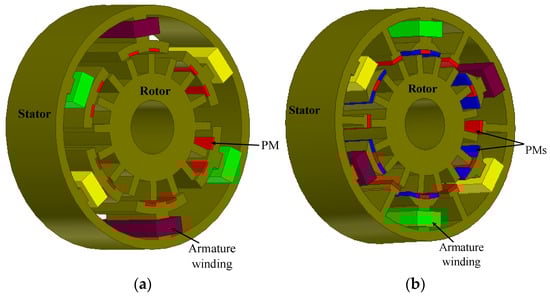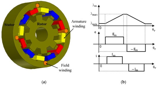 FRPMM have the advantages of a robust rotor structure and stator-mounted excitation configuration for easy heat management, making them very promising for both low-speed and high-speed applications [54]. The basic topology of the FRPMM is shown in Figure 6a.