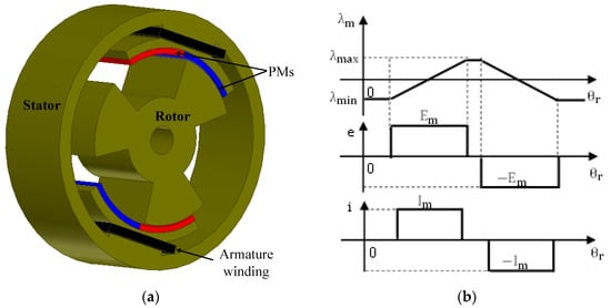 DSPMM has a small phase winding inductance due to positions of PMs. As the rotor rotate, the flux linkages of these PMs vary. It is this variation of flux that is responsible for back EMF in the stator winding. A non-load plot of flux linkage against rotor position is shown in Figure 3b [45,53]. The shape of the back-EMF is trapezoidal. Thus, brushless DC (BLDC) operation can be adopted. Also, a unidirectional torque is possible by introducing positive and negative current in the winding at the rising and falling of flux linkage, respectively.