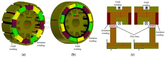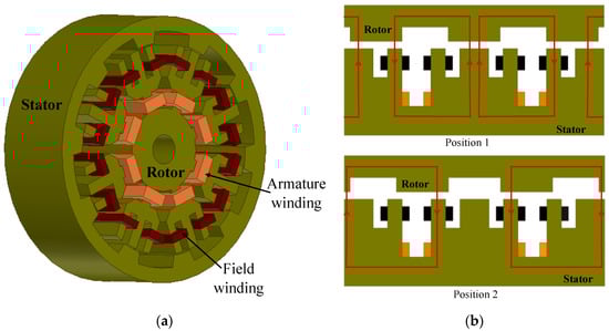 To solve the concerns of a limited field airgap flux control and a high cost posed by the DSPMM, a new configuration called the doubly salient wound field motor (DSWFM) was introduced [63]. In this new configuration, PMs in the DSPMM were replaced with field windings, as shown in Figure 4a.