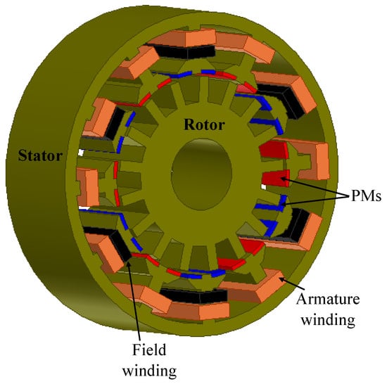 Since DSPMMs and DSWFMs are limited in EV applications due to their poor field weakening and low efficiency, respectively, both machines were merged to form a new configuration called the doubly salient hybrid-excited machine (DSHEM) [64], where the excitation sources are from PMs and DC electromagnets, as shown in Figure 5.