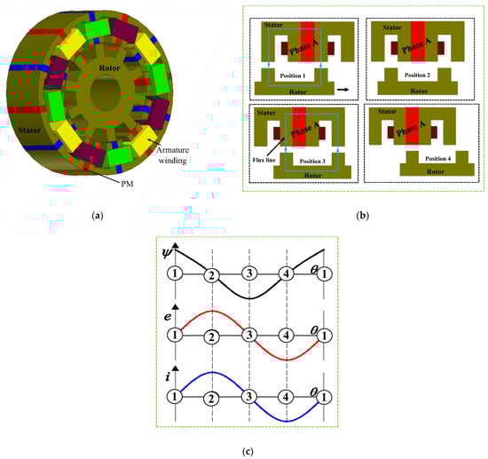 12/10-pole, 3-phase FSPMM: (a) motor topology; (b) rotor at four different positions; (c) idealized waveforms of flux-linkage, back-EMF, and phase current for the rotor positions.