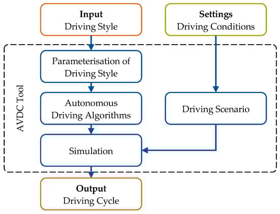 The structure of the tool was developed on the basis of these assumptions (Figure 2). The driving style of the AV is the input of the tool, and the driving cycle is the output. In addition, driving conditions such as traffic density, road category, and speed limits can be entered into the tool as settings.