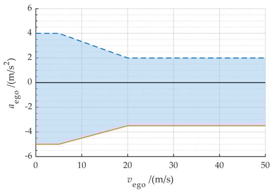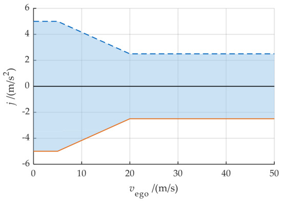 According to Lu et al., the typical value for is s, and the braking deceleration equals to for used tires on a flat road surface [37]. Finally, this results in the simplified Equation (2):