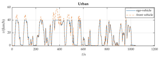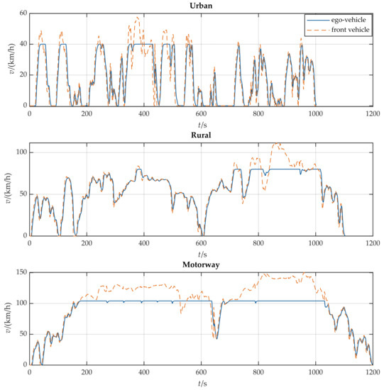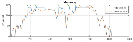 For simplification, only longitudinal dynamics were considered for all existing driving cycles [8], due to their use for evaluating the consumption and emissions of the powertrain. The lateral dynamics were neglected because their impact on the powertrain concept design is marginal. A purely longitudinal evaluation offers the option of executing the driving cycles on a vehicle test bench. In the cycles generated by the tool, the AV merely drives longitudinally along a virtual, straight road. Although the AV can overtake the front vehicle, the lateral dynamics and steering are disregarded.