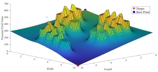 The principle of APF is to assume that the vehicle is in a virtual space; the attractive potential field generated by the target and the repulsive potential field generated by the obstacles. Attractive field has low potential energy and both start point and repulsive field have high potential energy. The superposition of these two potential fields forms an undulating space as shown in Figure 1 [27].