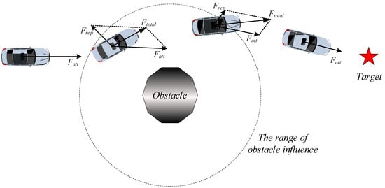 where is the threshold value for the distance between the vehicle and the target; is the attractive field modulation factor. The most significant difference after the improvement is that when the distance between the vehicle and the target is greater than , the gravitational force is considered constant.