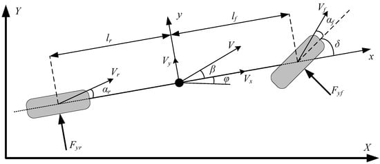 where and are the front wheel lateral deflection stiffness and the rear wheel lateral deflection stiffness, respectively. According to the coordinate system, the lateral deflection angle of the front and rear wheels of the vehicle can be expressed as:
